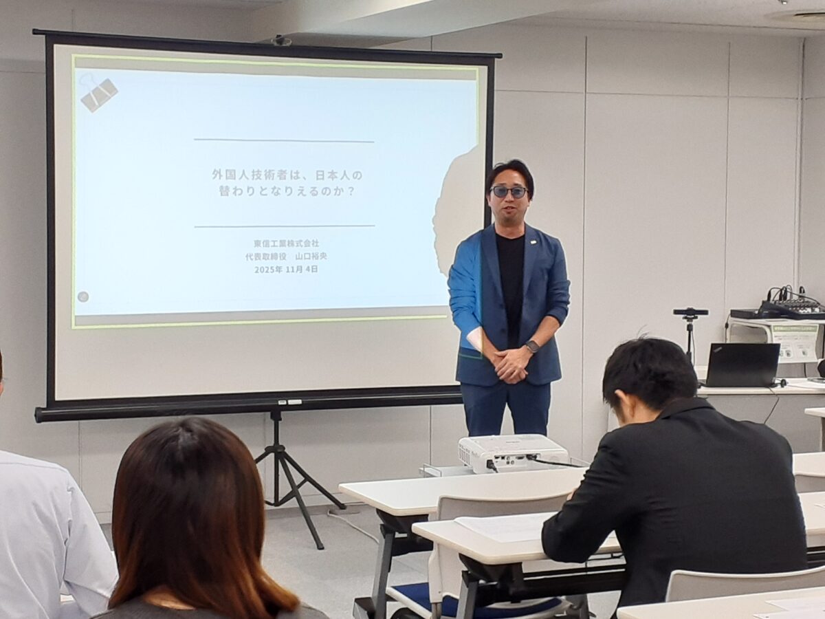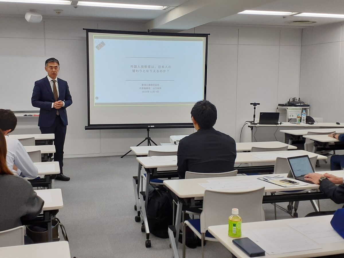 第1部は、「外国人正社員雇用について~外国人技術者は日本人の代わりになりえるのか~」という題目で、東信工業㈱様における外国人技術者雇用についての取り組みについてお話をお伺いしました。
